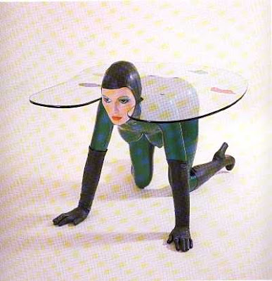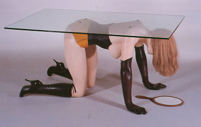Las esculturas de Allen Jones Perchero para sombreros y Escultura mesa, hechas en 1969, que muestran dos mujeres semidesnudas empleadas como muebles, son claros ejemplos de la fantasía de la objetificación sexual.