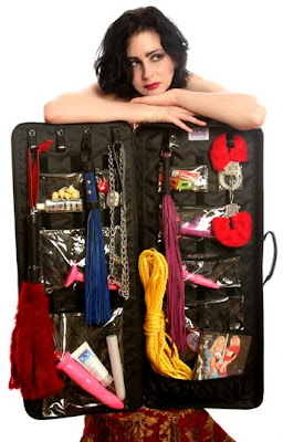 Hay variedad. Desde una maleta trolley bien grande, a cosas más pequeñas como discretas maletas látigos y floggers. Lo más pequeño, bolsitas para condones. Todo de «For your nymphomation».
