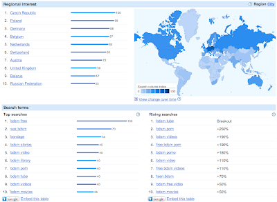 Si me voy a otra máquina, Google Insights, y busco por el término bdsm, me encuentro ¿qué paises son los más interesados en el tema? Pues la Republica Checa, Polonia (!), y los previsibles Alemania, Holanda, Países Bajos…