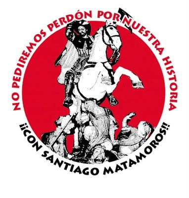 Había acertado en que una buena cantidad de caspa venía de la Contrarreforma y de la nostalgia por ese mundo medieval. Buena muestra es la imagen que pongo, de un grupo reciente (al que no enlazo), que suena muy parecido a una frase que ya conocemos de uno que también está anclado en la Reconquista, en ese pasado medieval…